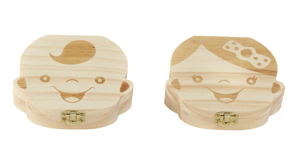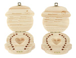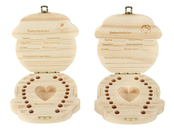 Aufklappbare Holz-Dose in Form eines Baby-Kopfes für Milchzähne. Die Dose hat eine Größe von 12,4x12cm und bietet Platz für 20 Milchzähne sowie die ersten Haare. Zudem können die Geburtsdaten (Name, Geburtstag, Größe, Gewicht, Blutgruppe und Sternzeichen) und "Wünsche für das Baby" eingetragen werden.
